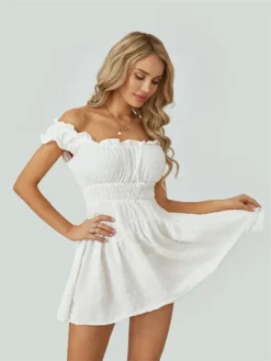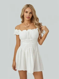 Women Summer Short Dress, Solid Color Ruched Bust Boat Neck Off Shoulder Puff Sleeve A-Line for Ladies