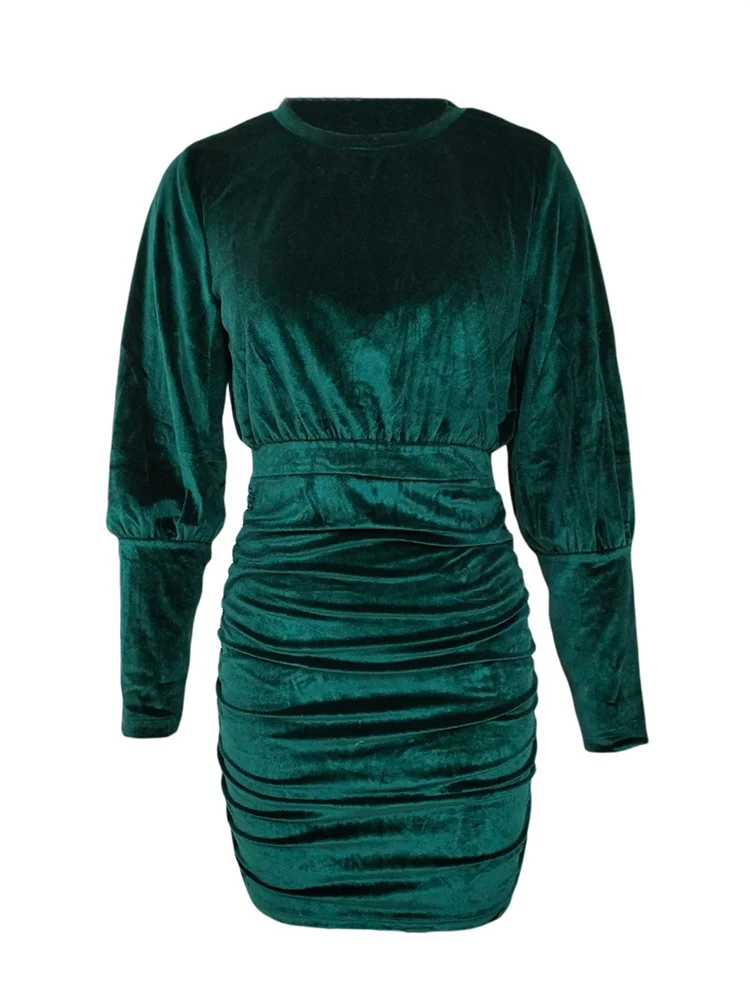 Women’s Fall Velvet Bodycon Dress Solid Color Round Neck Lantern Long Sleeve Ruched Mini Dress
