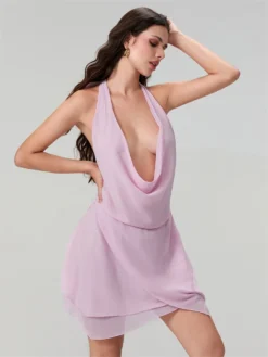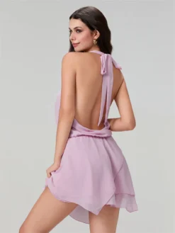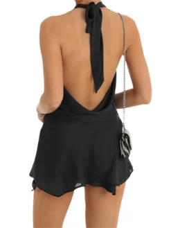 Womens Summer Short Sling Dress Solid Color Sleeveless Backless Hanging Neck Dress